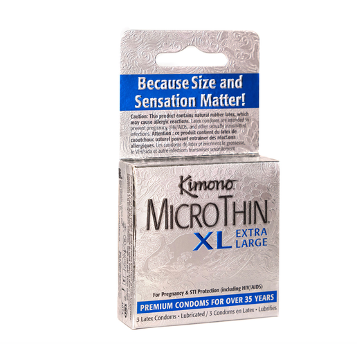 Kimono MicroThin XL is thin, strong, and extra-large for a comfortable fit. Extra-large 56mm base, flared shape More headroom Tested 5 times for reliability Exceeds US and international (ISO) strength standards Premium natural latex, vegan-friendly No unpleasant latex odor Formulated without parabens, glycerin, spermicide, or nitrosamines.