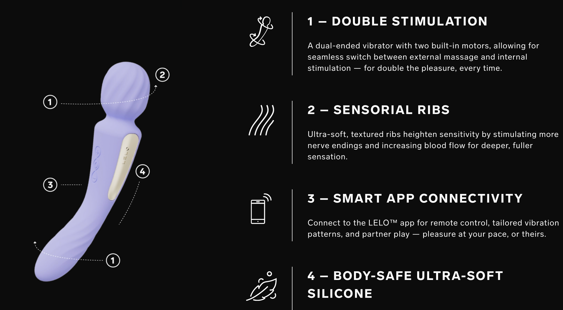 LELO SWITCH is a dual-ended vibrator designed for versatile pleasure. With two powerful motors one for external stimulation and one for internal it offers targeted sensations at both ends. The wand head features ultra-soft sensorial ribs for enhanced clitoral pleasure, while the other end delivers deep vaginal vibrations. LELO SWITCH connects to the LELO app, allowing for remote control and customizable settings. Compact, elegant, and functional, it’s a modern upgrade to the classic wand massager.