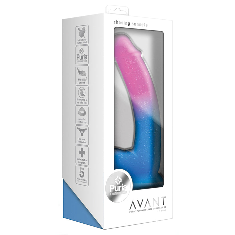 Modern, stylish, and beautiful - meet the Avant Chasing Sunsets! This unique, handcrafted dildo has a brightly-colored gradient effect and subtle glitter sparkle to bring some magic to your playtime. The strong suction cup base can be secured to any flat, clean surface for hands-free play, or is harness compatible for partnered fun! Chasing Sunsets has silky smooth UltraSilk and is made of Puria platinum-cured silicone, making it body-safe and free of phthalates, paraffins, fragrance, and latex. Beautiful to behold and made with your pleasure in mind, time to start Chasing Sunsets!